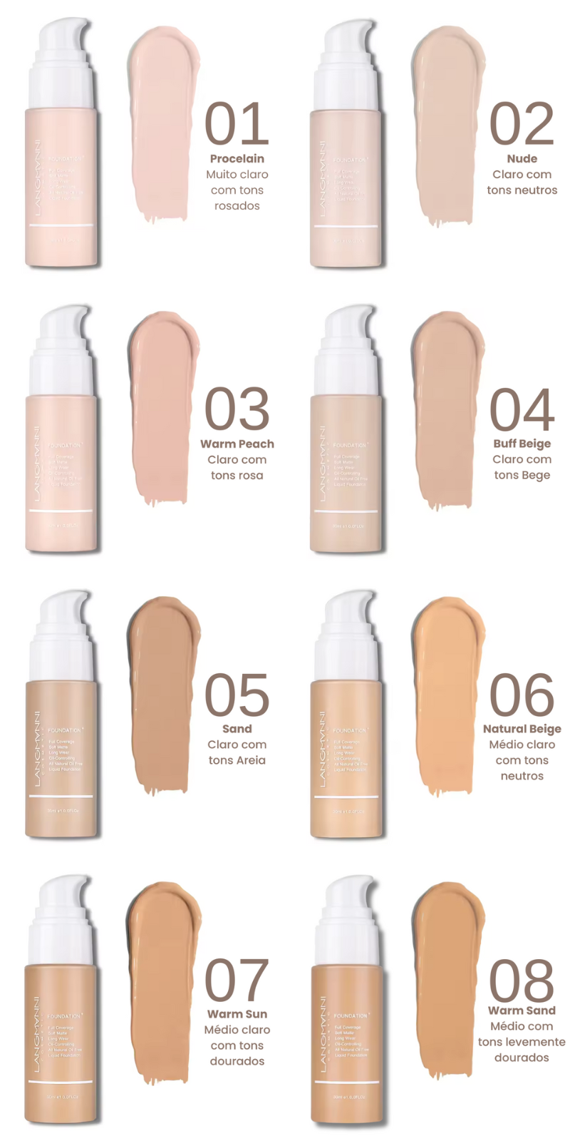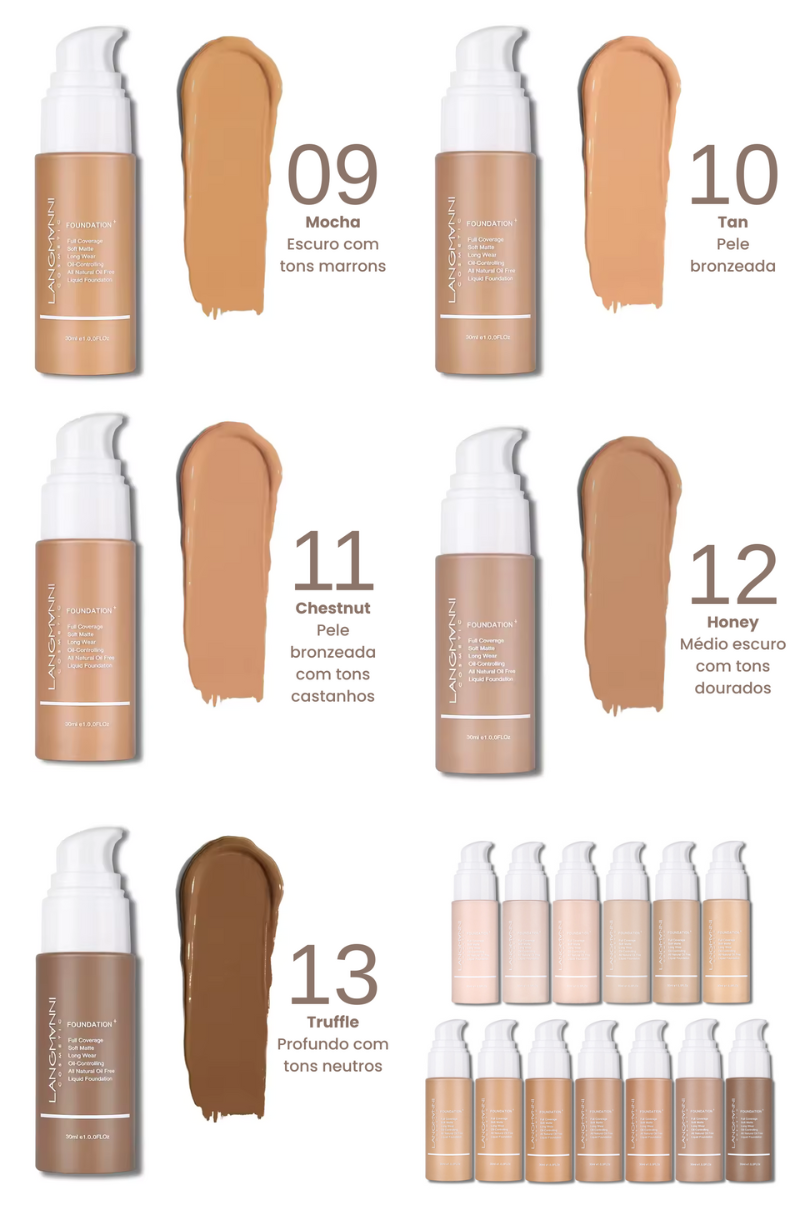 Especificações Técnicas: Marca: Langmanni. Tipo: Base Líquida + Corretivo. Volume: 30ml. Acabamento: Soft Matte. Cobertura: Alta (Full Coverage). Propriedades: Disfarce de poros, efeito natural, resistente à água, ação clareadora. Fórmula: Oil Free, natural. Indicação: Todos os tipos de pele. Validade: 3 anos
